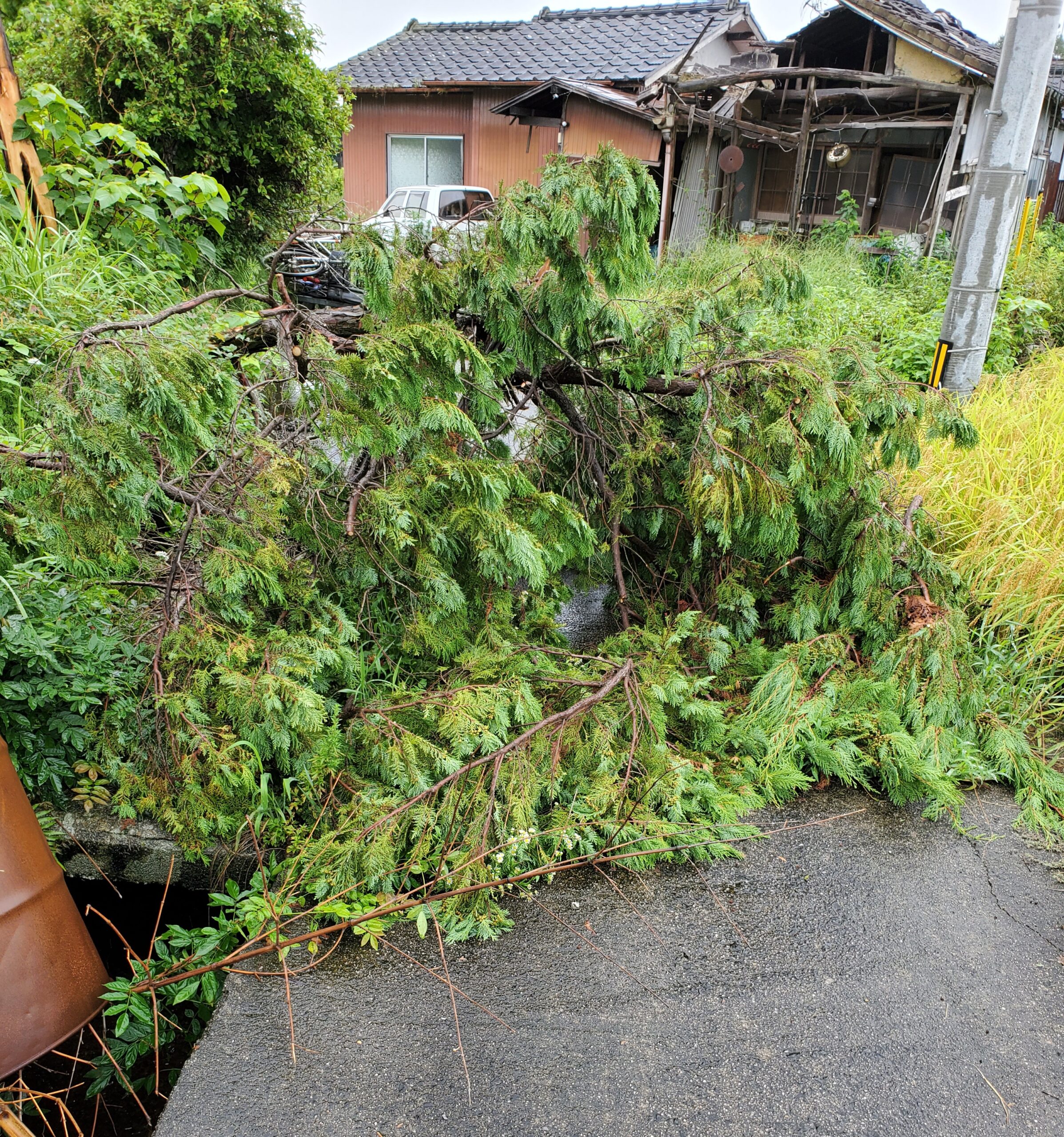 先週の大雨と強風で、近くの農道に木が倒れて道をふさいでいたので、役場土木課に相談したら、ものの5分で片付けてくれました!